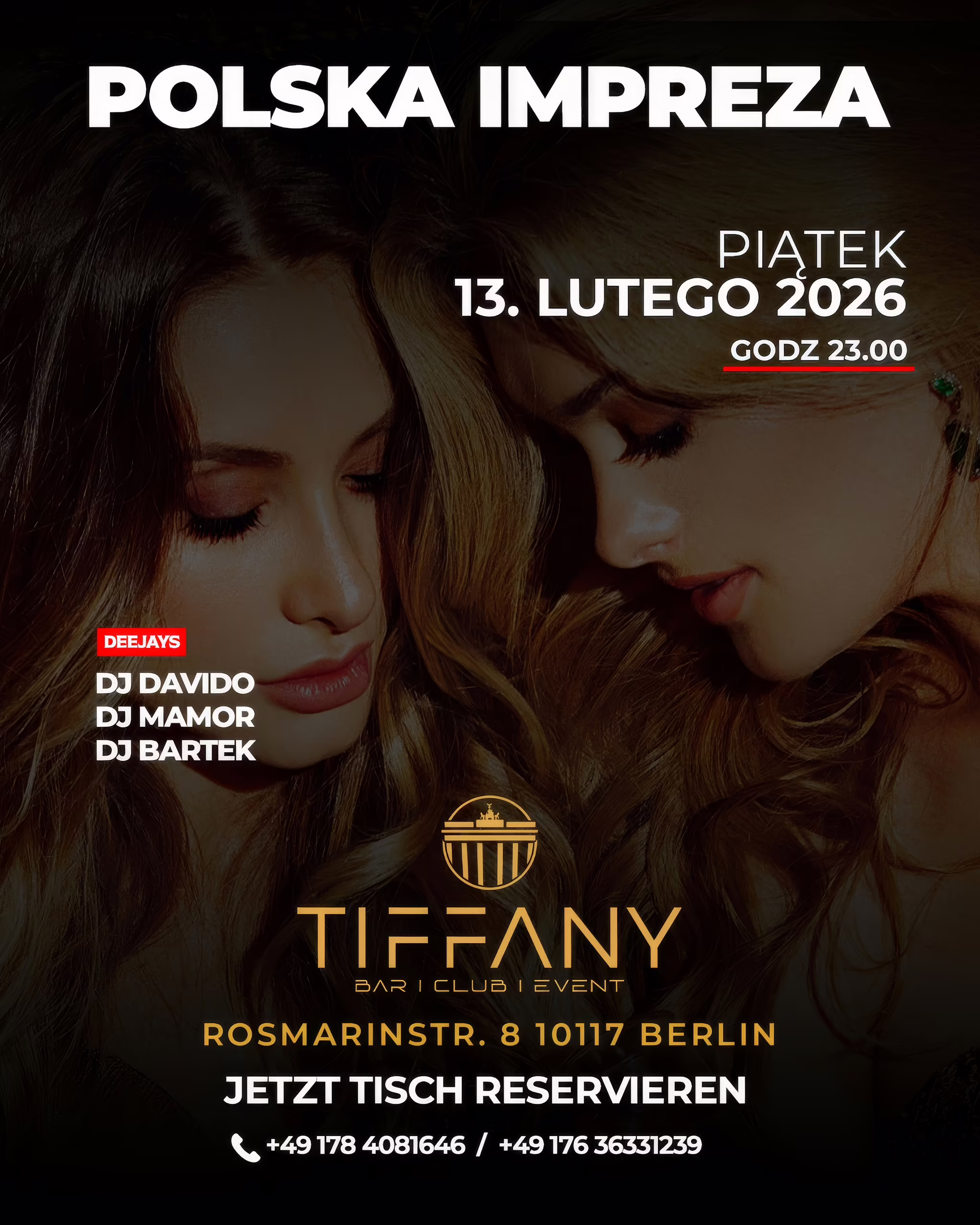 Tiffany Club, zlokalizowany w historycznej dzielnicy Mitte, uchodzi za jedno z najbardziej stylowych miejsc na mapie nocnego życia Berlina. Nowoczesny wystrój i profesjonalne nagłośnienie lokalu stanowią idealną oprawę dla cyklu imprez dedykowanych polskiej społeczności. Program muzyczny opiera się na starannie wyselekcjonowanych utworach, wśród których dominują największe polskie przeboje, nurty black music oraz taneczne standardy.
